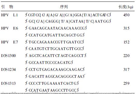 1.2.3 HPV DNA检测(表 1)引物:选用可扩增HPV各型的通用型引物L1及分别扩增HPV16、18型的E6、E7特异性引物3对。PCR扩增:PCR反应试剂(大连TaKaRa宝生物工程公司)。扩增条件为94℃ 30s,55℃ 30s,72℃ 1min共30个循环,72℃延伸5min。每次实验均设阳性对照,对照标本为已证实有HPV感染的尖锐湿疣标本,HPV16、18型对照分别用已知阳性感染的宫颈癌细胞系Siha、Hela基因组DNA。配制1.5%的琼脂糖凝胶,核酸染料染色,上样,100V电压下电泳约30min,于紫外透视仪上观察结果并照相。
