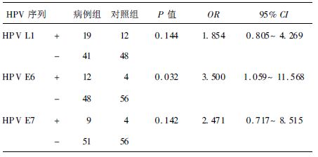 2 结果 2.1 HPV DNA PCR检测结果(表 2)HPV通用序列L1在肺癌组织中的检出率为31.67%(19/60),与对照组20.00%(12/60)比较差异无统计学意义,HPV特异序列E6、E7的检出率分别为20.00%(12/60)和15.00(9/60)。HPV E6序列检出即HPV16感染的非吸烟女性患肺癌的危险度是未感染者的3.50倍,P<0.05。