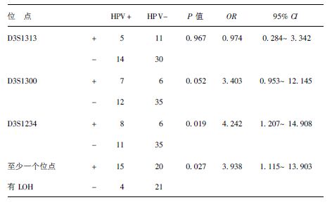 对3个位点进行LOH分析,60例肺癌组织中有35例(58.33%)存在一个或多个位点的LOH。D3S1234,D3S1300,D3S1313 3个位点的LOH发生率分别为26.67%,21.67%,23.33%。在HPV DNA检出的组织中该基因的杂合子丢失率更高(78.94%),与HPV感染阴性的组织(48.78%)相比差异有统计学意义,OR=3.938,95%CI=1.115~13.903,提示HPV DNA的插入使FHIT基因多个位点杂合子丢失频率增加(P<0.05)。