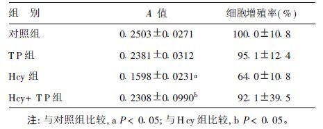 1.3 MTT法检测细胞活性取适量细胞悬液接种于96孔培养板。24 h后,按实验分组要求剂量分别加入Hcy(5 mmol/L)和TP(25 mg/L)。24 h后,加MTT溶液10 μl,继续培养4 h,弃去培养液,加150 μl二甲基亚砜(DMSO),570/492 nm测定吸光度值(A),计算细胞增殖率,每组平行样品7个。增殖率=实验组吸光度值/对照组吸光度值×100%。