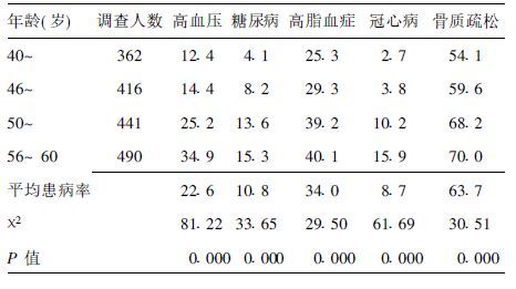 2.3 主要慢性病发生情况(表 1)被调查者主要慢性病患病率均较高。骨质疏松、高血压、糖尿病、高脂血症、冠心病等慢性病患病率分别为63.7%,22.6%,10.8%,34.0%和8.7%。不同年龄组慢性病患病率不同,随年龄增长患病率呈上升的趋势。