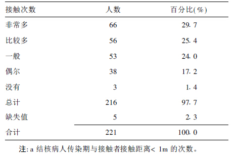 2.4 流行病学特征(1) 持续接触时间:接触者221人中,在结核病患者传染期与其经常接触有190人,偶尔接触的有31人。每d接触时间≦5h有66人;每d接触时间≦10h有34人;每天接触时间≥10h有90人。患病的11名接触者中,在结核病患者发病后到用药与其经常接触的有9人,占81.8%;其中每d接触结核患者超过5h的有8人,占72.7%;每d接触结核患者超过10h的有5人,占45.5%。(2)近距离接触次数(表 1):在患者传染期,57.5%以上的人与患者接触(R≦1m)的次数较多,且没有使用任何防护措施。在11例患病的接触者中,2人接触次数(R≦1m)比较多,5人接触次数(R≦1m)非常多,占45.5%;比例远远高于未患病的接触者。