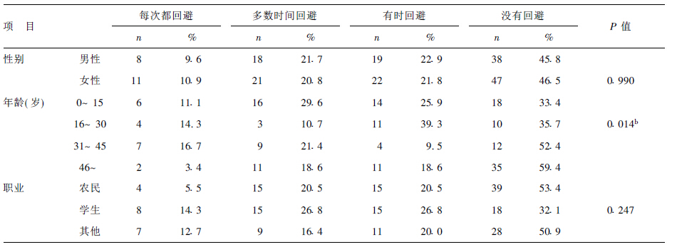 | 表 2 不同性别、年龄、职业接触者回避情况 |