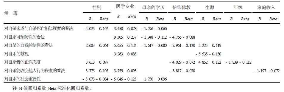 分别以7个自杀态度量表的得分为因变量,采用多元逐步回归方法分析影响大学生自杀态度的因素。在α=0.05的检验水准下,性别、专业、母亲的学历、佛教信仰、生源、年级被分别引入不同的自杀态度分量表。