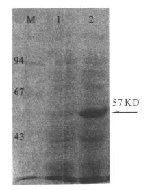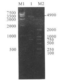 注:M1:DL7500DNA marker;1:BamH I和EcoR I双酶切重组pGEX-4T-1;M2:DL2000 DNA marker。 图 2 重组pGEX-4T-1双酶切鉴定 |