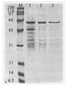 注:M:Low MW protein marker; 1:上清液;2: GST糖珠;3:洗脱液。 图 4 HP0410纯化 |
