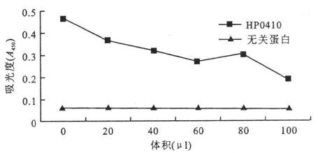 1.2.8 竞争抑制实验每孔100μl的10μg/ml E018共6孔,4℃包被过夜,加入封闭液4℃1h,0.1%TBST洗板6次,拍干。每孔加入100μl展示候选表位的噬菌体扩增液,并按顺序分别加入0,20,40,60,80,100μl浓度为100μg/ml的HP0410,混匀,室温振荡1h,0.3%TBST洗板6次,拍干。每孔加入1:5000稀释的HRP标记噬菌体抗体100μl,室温振荡1~2h,0.5%TBST洗板6次,拍干。加入100μl可溶性TMP底物,37℃避光反应10min,用2 mol/L硫酸终止反应,450nm处读取吸光度(A)值。