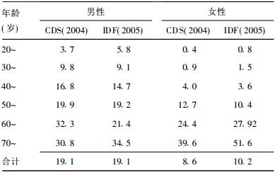 2.2 MS患病率 2.2.1 男、女MS患病率及标化患病率 (表 1)CDS2004的MS患病率略高于国际糖尿病联盟 (IDF2005) MS标准。CDS 2004总患病率为15.2%(男、女性分别为19.1%与8.6%),标化患病率为11.2%(男、女性分别为14.3%与7.4%),并且男性患病率显著高于女性 (P < 0.01)。MS标化患病率经全国第5次人口普查年龄构成标化。