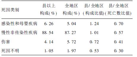 2.2 死因谱比较 2.2.1 主要疾病死亡原因比较(表 1)从死亡的构成比较可以看出,县以上医院的感染性和母婴疾病、慢性非传染性疾病比例较高,分别是全地区的1.24, 1.01倍。从县/全地区(指县以上医疗机构死亡占全地区死亡,下同) 的死亡数比较可见,感染性和母婴疾病医院死亡比例最高,为70%;死因不明比例最低,为30%。