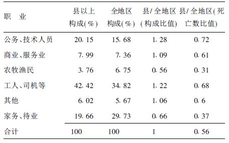 2.3.4 职业(表 2)县/全地区的构成比较可见,公务、技术人员中县/全地区为1.28倍,顺位也不同,县以上前3位是工人、公务、技术人员、家务,而全地区中是工人、家务、公务、技术人员。县/全地区死亡数比较看出,72%的公务技术人员死于县以上医院,而农牧渔民只有31%死于县以上医院。