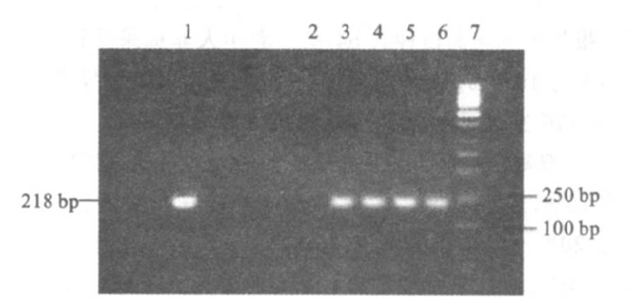 注:1:DHBV强阳性鸭血清;2:DHBV阴性鸭血清对照;3,4,5,6:DHBV阳性鸭血清;7:100 bp探针。 图 1 PCR法检测鸭血清DHBV病毒携带结果 |