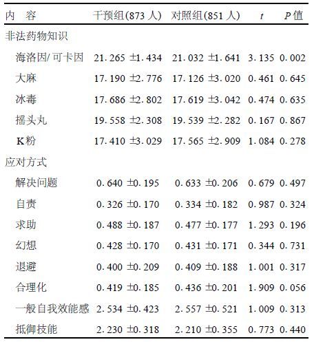 2.2 干预前2组认知、应对方式、自我效能和抵御技能比较(表 1)干预前2组学生除对海洛因/可卡因的认知得分差异有统计学意义(P<0.05)外,其他各项目差异均无统计学意义,干预组学生和对照组学生干预前具有良好的均衡性。