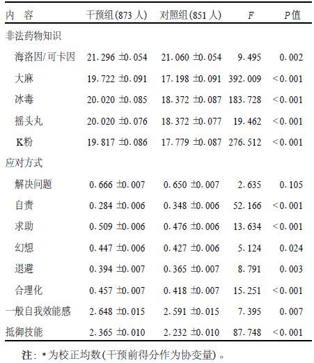 (表 2) 干预后干预组有关非法药物认知、自我效能及抵御技能的得分较对照组均有不同程度提高(P<0.01),干预组学生显示了较高的认知度和自我效能感、良好的应对方式和抵御技能。