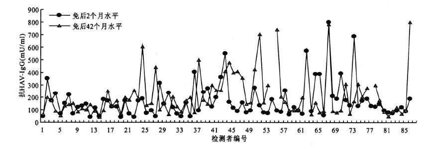 注:免后42个月抗-HAV IgG水平检测者编号55#:1 536 mU/ml; 63#:2 836 mU/ml; 78#:3 040 mU/ml。 图 1 免疫后2 个月与42 个月抗- HAV IgG抗体水平比较 |
