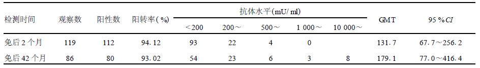 2 结 果 2.1 免疫后抗体水平(表 1)| 表 1 冻干甲型肝炎减毒活疫苗接种42个月血清学效果 |