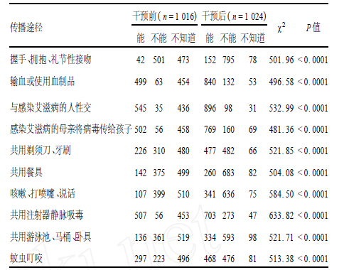 | 表 3 干预前、后艾滋病传播途径回答情况 |