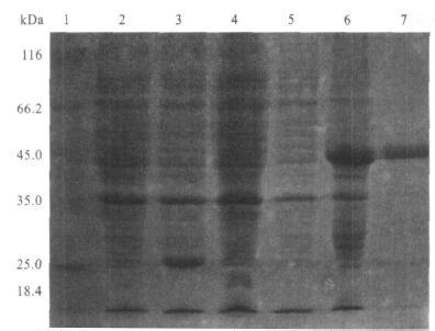 注: 1: 蛋白标准; 2: pET-28a(+) 质粒用IPTG 诱导; 3: pET-28a(+) 质粒未用IPT G 诱导; 4: pET-28a(+)-WD40 重组质粒用IPTG 诱导; 5: pET-28a(+)-WD40 重组质粒未用IPT G 诱导; 6:pET-28a(+)-WD40 重组质粒诱导后菌液沉淀; 7: 破包涵体后得到的纯化蛋白。 图 2 重组质粒pET-28a(+)-WD40 在大肠埃希菌BL-21/ DE3 的表达产物的12%SDS-PAGE 电泳分析 |