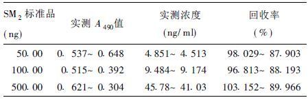 2.3.3 SM2加标回收(表 1)在SM2阴性的鸡肉样品中加入一定量的SM2标准溶液,提取后用本文建立的竞争ELISA法进行检测,平均回收率为99.331%~88.687%。