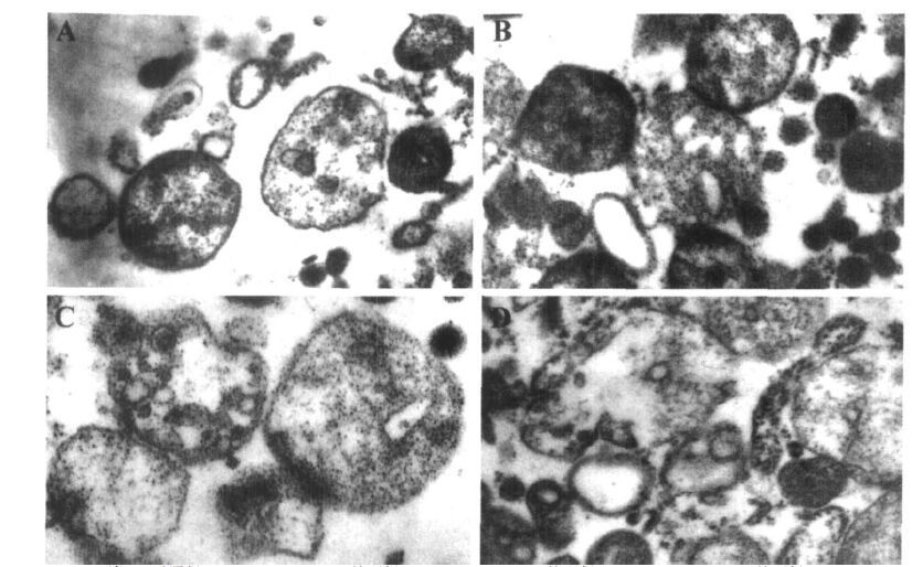 注: A: 对照组; B: 1 Lmol /L CdCl2 处理组; C: 5 Lmol/ L CdCl2 处理组; D: 10 Lmol/L CdCl2 处理组。 图 2 线粒体形态改变的电镜观察(×12000) |