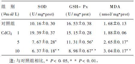 随着CdCl2浓度的增大,SOD和GSH-Px的活性逐渐降低,MDA的含量趋于升高,呈一定的剂量-反应关系,其中5和10 μmol/L CdCl2处理组与对照组比较,差异均有统计学意义(P<0.05或P<0.01)。