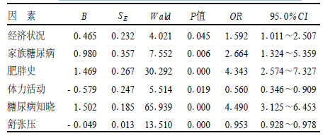 经糖尿病可能危险因素非条件Logistic回归分析, 发现糖尿病与经济状况、家族糖尿病史、肥胖史、体力活动、糖尿病知晓率及舒张压等因素密切相关, 但未发现糖尿病与性别、年龄、职业、文化程度、重大疾病史、婚姻状况、业余活动、饮食习惯、饮酒、吸烟、体重/身高、BMI及收缩压等因素有密切关系。