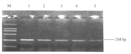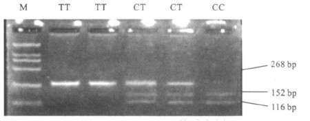 观察对象DNA经PCR扩增产物为268bp的片断; 若在此片断不存在825C→ T位点突变, 则产生限制性内切酶Bse D I的位点, 酶切后得到片断大小为152和116bp 2个片断。基因型为CC型; 若含有C→T位点突变, 酶切后得到大小为268 bp的片断, 基因型为TT型; 酶切后既得到268 bp, 又得到152和116 bp片断者, 基因型为CT型。