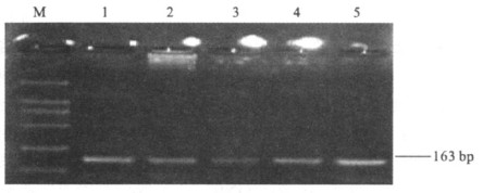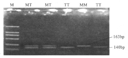 观察对象DNA经PCR扩增产物为303bp的片断, 依据AGT基因在第2外显子704处核苷酸由胸腺嘧啶(T)置换为胞嘧啶(C), 造成第235位由蛋氨酸变异为苏氨酸(M→T), 可产生3种基因型。产生PsyⅠ酶切识别序列位点, 经PsyⅠ内切酶消化后, 产生AGT基因苏氨酸等位基因纯合型(TT型); 反之, 未产生识别序列位点, 经限切酶消化后为蛋氨酸等位基因纯合型(MM型), 介于其中的为杂合型(MT型)。AGT基因PCR扩增产物为163 bp DNA片段, TT型存在T→C的突变, 则扩增产物经酶切后, 被切成2部分即140和23 bp, 由于23 bp片段小, 一般在电泳后被排除凝胶外, 故只能观察到140 bp的1个条带; MM型保留163 bp 1条带; MT型产生163, 140和23 bp的3个条带, 电泳图可观察到163和140 bp的2个条带。