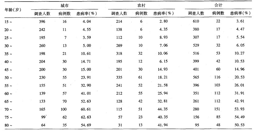 表 1可见, 随年龄增长, 城乡居民高血压患病率逐渐增高; 35岁~患病率增幅明显加大。
