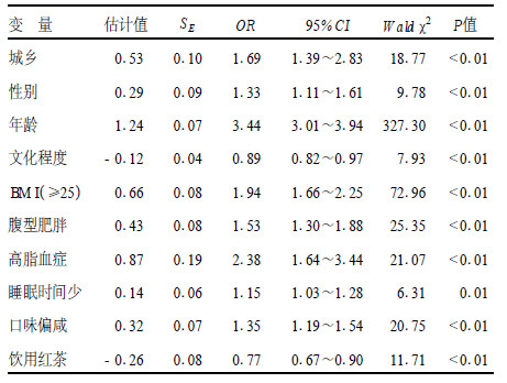 多因素Logistic回归分析结果显示, 高血压发生与城乡差别、性别、年龄、文化程度、体质指数(BM I)、腹型肥胖、高脂血症、睡眠时间少、口味偏咸、饮用红茶等因素有关。其中, 城乡差别、男性、年龄、体重超重或肥胖(BM I≥25)、腹型肥胖、高脂血症、睡眠时间少、口味偏咸为危险因素。文化程度高、饮用红茶为保护因素。