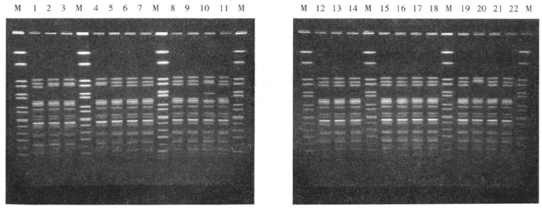 注:M:参考菌株;暴发分离株中:1,10,20分别为XbaI002型、XbaI007型和XbaI006型;3,4为XbaI003型;5~9、12~14、16~19均为XbaI001型;11,15,22均为XbaI004型;2:散发分离株,XbaI003型;21:生猪肉分离株,XbaI001型。 图 1 部分菌株PFGE电泳图谱结果 |