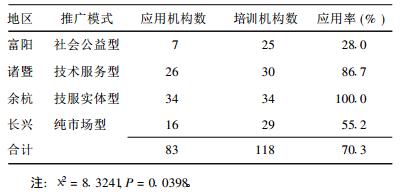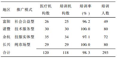2.2 推广应用情况 2.2.1 技术推广覆盖率在接受培训的118家医疗机构中, 开展NBAP检测的有83家, 技术推广覆盖率为70.3%(83/118)。研究地区应用该技术的农民人数达10 782例, 4个地区的乡镇平均应用率达71.2%。4种推广模式中以技术服务为主的2种模式推广应用率显著高于其他模式, 其中余杭达100.0%, 诸暨达92.3%。