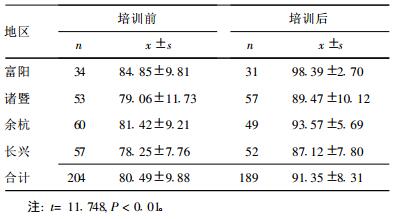 在培训前后对学员进行了理论知识测试考核。培训前后知识测试成绩的差异有统计学意义(P < 0.01), 培训后成绩显著高于培训前。