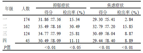 | 表 1 不同年级大学生抑郁和焦虑症状评分情况(x±s) |