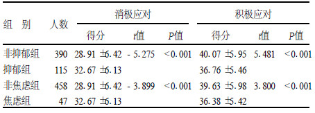 1.2 方法以班级为单位,统一时间组织学生在教室独立完成。测量工具包括:(1) Zung抑郁自评量表(SDS),焦虑自评量表(SAS)〔2〕,将得分0~49归为非抑郁、焦虑情绪组,得分≥50为抑郁、焦郁情绪组;(2)特质应对方式问卷〔2〕;(3)领悟社会支持量表〔2〕。