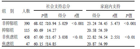 本次调查发现,社会支持总分和家庭内支持因子与抑郁、焦虑情绪之间呈显著负相关,与陈娟、张泽武报道一致〔6〕。可以看出大学生在面临困难和生活事件而焦虑时,领悟到社会支持可以提高大学生应对压力的信心和勇气,并阻断焦虑向抑郁转化,最终降低抑郁水平。提示面对承受着心理压力的大学生,应给予更多的关爱和支持,使他们感受到集体、家庭的温暖,帮助他们提高心理社会适应能力。在给大学生提供各种温暖和支持的同时,重点提高学生社会认知能力,培养学生积极的情感体验及情绪调节能力,以提高大学生的社会支持感,促进身心健康。