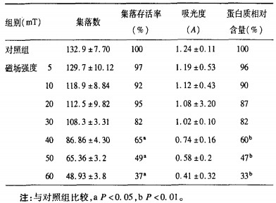 正常对照组新生小鼠肾上皮细胞培养,初期呈圆形分散分布,胞体呈圆形或菱形,部分细胞开始长出突起。随着时间延长,胞体增大,细胞之间有相连接现象,突起也逐渐发育生长,10 d后形成明显的集落,当稳恒磁场强度为40,50,60 mT时,集落形成率比对照组明显降低(P < 0.01),而且出现细胞脱落、漂浮、细胞明显崩解、细胞碎片等现象。当稳恒磁场的磁感应的磁感应的磁感应强度为40,50,60 mT时相对蛋白质含量比对照组明显降低(P < 0.05)。