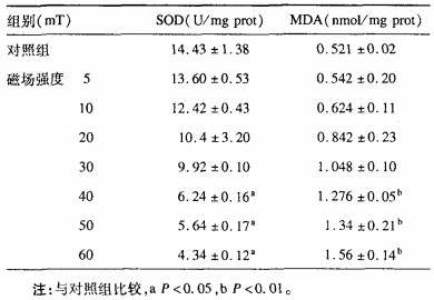 2.2 稳恒磁场对新生小鼠肾上皮细胞MDA、SOD的影响(表 2)| 表 2 不同稳恒磁场强度对新生小鼠肾上皮细胞SOD活性和MDA含量影响(x±s, n=10) |