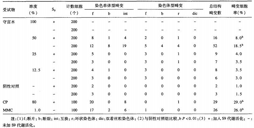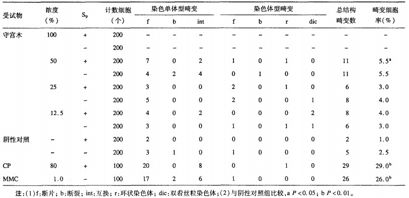 | 表 2 守宫木对体外V79细胞染色体畸变分析 |