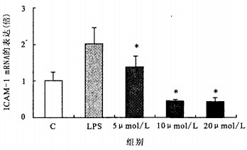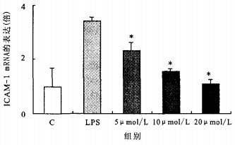 注:与LPS组比较,* P < 0.05。 图 1 莱菔硫烷对LPS诱导的ICA M -1 mRNA表达的抑制作用 |