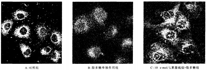 采用免疫荧光杂交反应,并用激光扫描共聚焦显微镜观察NF-κB由细胞浆向细胞核内转位情况。图 3可见,细胞在静息状态下,细胞浆内呈现强烈的绿色荧光,表明NF-κB主要存在于静息细胞的胞浆内(图 3A);脂多糖(100 ng/ml)作用ECV304细胞30 min后,细胞浆内强烈绿色荧光减弱而胞核呈现强烈的绿色荧光,提示脂多糖能明显诱导NF-κB由细胞浆向细胞核内转位(图 3B);10 μmol/L莱菔硫烷作用后再用脂多糖处理细胞,细胞核中的绿色荧光明显弱于脂多糖单独处理组,提示莱菔硫烷能明显抑制脂多糖诱导的NF-κB向核内的转位(图 3C)。
