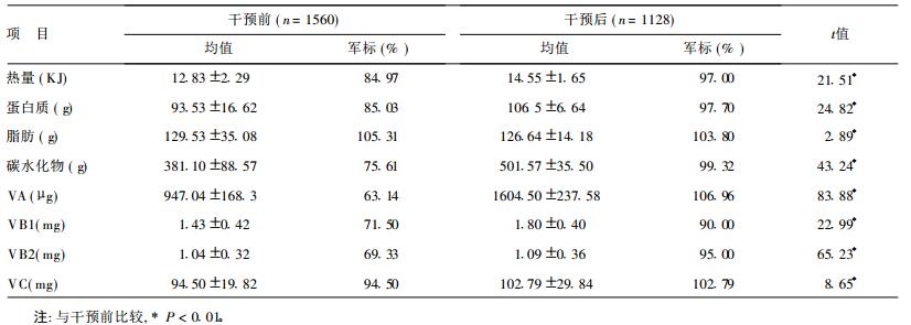1 对象与方法 1.1 对象均为男性驻礁人员。以伙食单元(伙房)为单位进行膳食调查, 并对其中部分人员进行体格检查和生化检查(以自然组为单位, 每组随机抽取2~3人)。干预前行膳食、体格和生化检查人次数分别为1 560, 708和180人次。干预后行膳食、体格和生化检查人次数分别为1 128, 685和162人次。干预前后时间间隔为2年, 岛礁相同、驻礁人员构成基本相同, 年龄17~38岁, 平均为(22.94±4.91)岁; 身高162~182 cm, 平均为(171±4.49) cm; 体重52~92 kg, 平均为(65.05±6.95) kg。已婚占32.8%, 未婚占67.2%。高中以上学历(含高中、中专)占68.7%, 初中以下学历(含初中)占31.3%。工龄1~18年, 守礁1~22次, 守礁时间3~70月不等。