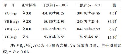 干预前体内维生素A、C含量均在正常标准范围内, 体内维生素B1、B2含量明显偏低, 尤以维生素B1明显; 干预后体内维生素A、C、B1、B2含量均明显升高, 维生素B1、B2平均值均升至正常标准。干预前后体内维生素含量差异有统计学意义(P < 0.01)。体内维生素B1、B2低于正常标准的人数占调查总人数的比例分别由干预前的85.56%和72.78降至干预后的11.11%和9.44%, 差异有统计学意义(P < 0.01)(表 2)。