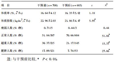 干预后体脂率虽略有降低, 但其变化差异无统计学意义。干预后体质指数明显改善, 除瘦弱人数比例无明显变化外, 超重和肥胖人数占调查总人数的比例分别由干预前的30.37%和17.09%降至干预后的21.17%和7.74%。体质指数正常的人数比例由干预前的51.84%升至干预后的70.66%。干预前后体质指数及超重、肥胖、体质指数正常的人数比例差异均有统计学意义(P < 0.01)(表 3)。