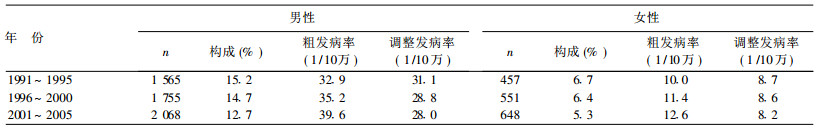 1.3 统计分析发病例数、粗发病率、世界人口调整发病率的计算采用IARC的Canreg 4登记软件。应用Excel相关函数来实现调整截缩率(以下均简称为截缩率)和累计率等的计算。发病率的时间变化趋势通过对发病率的对数转换和病例数加权的线性回归分析来实现,在此基础上对回归系数的通用指数运算获得发病率的年度变化百分比(APC)。应用模型选择对数线性分析〔6〕(Model Selection Loglinear Analysis),通过迭代比例拟合性别、年龄、时期、队列等因素,采用向后删除法自动筛选有显著性的因素效应,获得最佳对数线性模型。进行各显著性因素相互调整后的发病危险性和95% CI的估计。采用SPSS 13.0统计软件进行回归模型的拟合以及发病危险性估计。