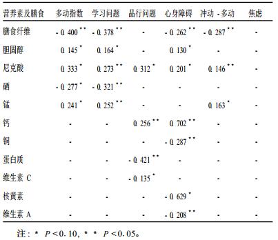 2.4 营养素与学习行为障碍因子之间的关系(表 1)| 表 1 营养素、膳食与各种因子之间的关系(r) |