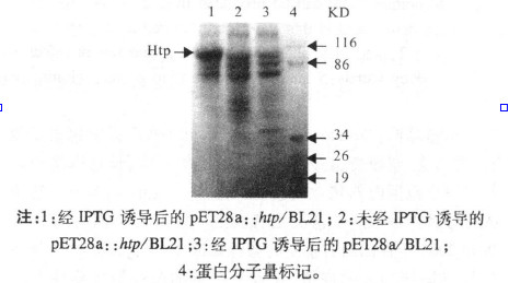 重组表达载体pET28a::htp通过BamH I/Sal I双酶切后,1%琼脂糖电泳显示,05ZYH33中htp片段的长度约2700 bp,序列测定显示该片段全长2727 bp,编码909个氨基酸。
