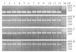 注:A:vcc基因; B:ctxA基因; C:tcpA基因; D:LPSgt基因; 1~12:退火温度分别为50.0,50.3,51.1,52.4,53.8,55.3,56.7,58.1,59.6,60.9,61.7,62 ℃; M:DNA Marker Ⅰ。 图 1 PCR退火温度的优化结果 |