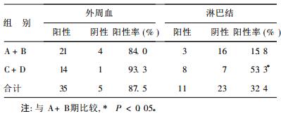 40例大肠癌患者,按临床分期分为A+B、C+D 2组,比较2组CEA mRNA表达差异。表 1可见,临床分期与淋巴结CEA mRNA阳性表达呈密切相关性,差异有统计学意义(χ2=5.4,P < 0.05)。C+D期大肠癌患者外周血中CEAmRNA阳性率较A + B期为高, 但差异无统计学意义(χ2=0.75, P > 0.05)。