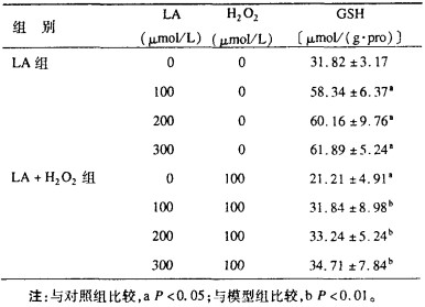 2.2 不同浓度LA和H2O2对大鼠脑匀浆GSH含量的影响(表 2)| 表 2 不同浓度LA和H2O2对大鼠脑匀浆GSH含量的影响(x±S, n=6) |