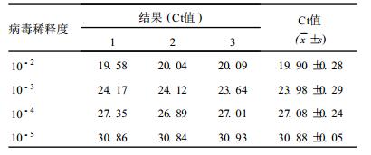 2.3 重复性试验(表 1)| 表 1 荧光定量RT-PCR法检测肠道病毒EV71重复性试验 |